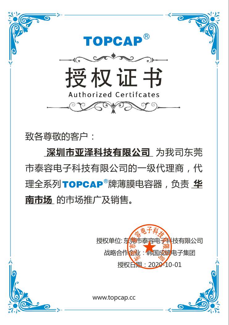 東莞市泰容電子科技有限公司授權(quán)我司為一級代理商,代理全系列TOPCAP牌薄膜電容器,負(fù)責(zé)華南市場的開發(fā)與推廣銷...